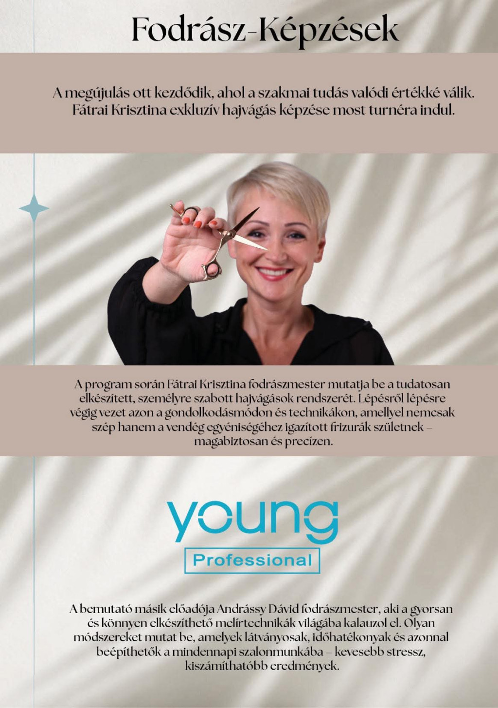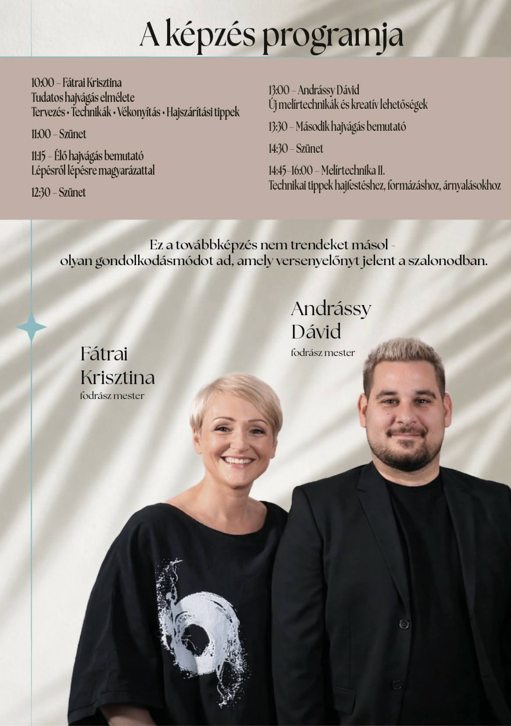 A program során Fátrai Krisztina fodrászmester mutatja be a tudatosan elkészített, személyre szabott hajvágások rendszerét.